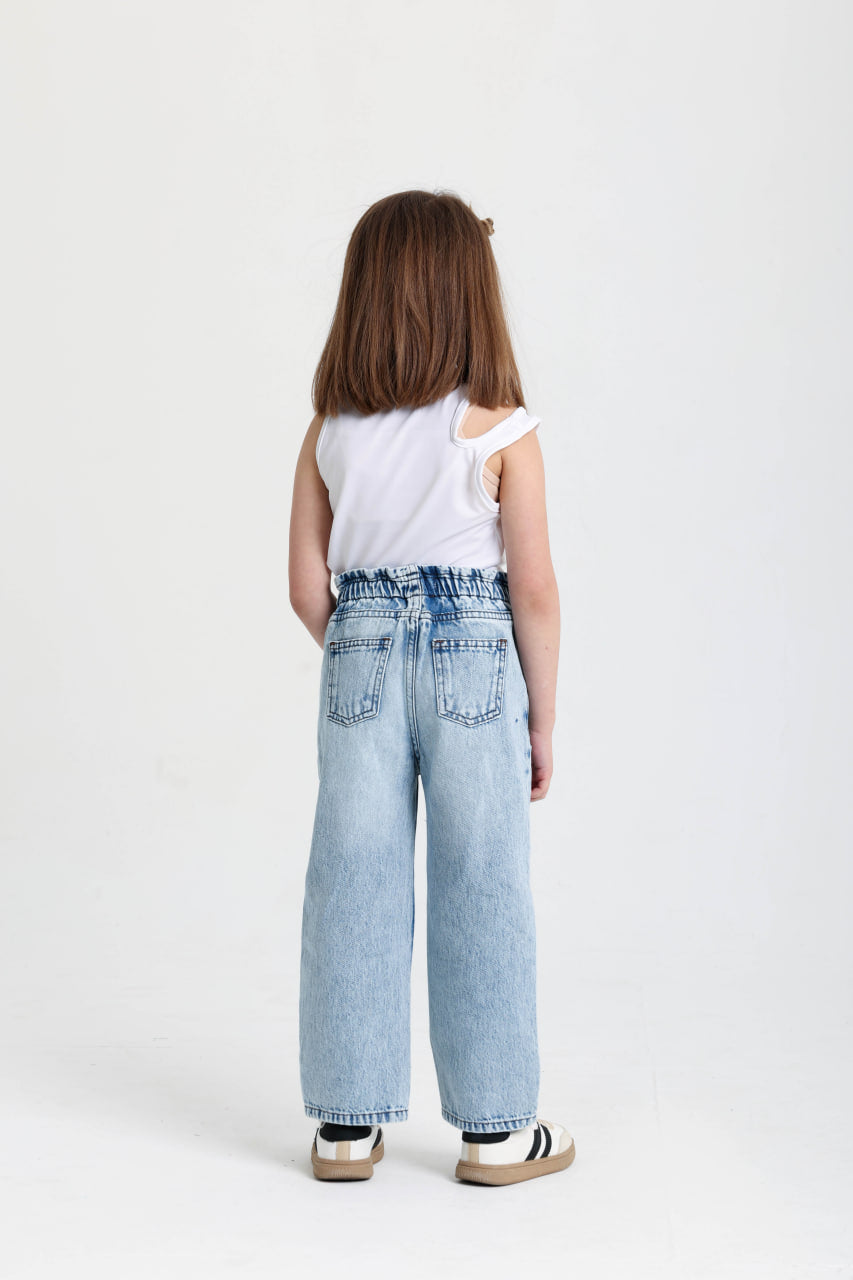 The design begins with a comfortable high-rise waistband featuring a soft elastic finish that provides a secure yet flexible fit. This thoughtful detail makes the jeans easy to pull on while ensuring they stay comfortably in place during active moments. From the waist, the relaxed silhouette flows down into straight, easy-moving legs that create a casual and modern style. The light cloud-wash denim finish adds a fresh, playful look, while subtle fading gives the jeans a naturally worn-in character. Classic front pockets offer practical functionality, and a small printed detail near the hem adds a unique design touch.